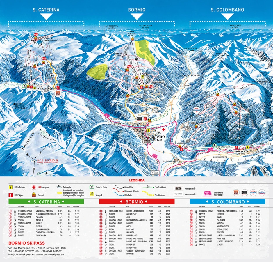 Ze szczytu Cima Binaca prowadzą szerokie nartostrady, ale także nieprzygotowane zjazdy, będące dużą atrakcją dla amatorów freeridu i dla snowboardzistów. Na Bormio 2000 można znaleźć łatwiejsze trasy, odpowiednie dla dzieci i początkujących narciarzy.