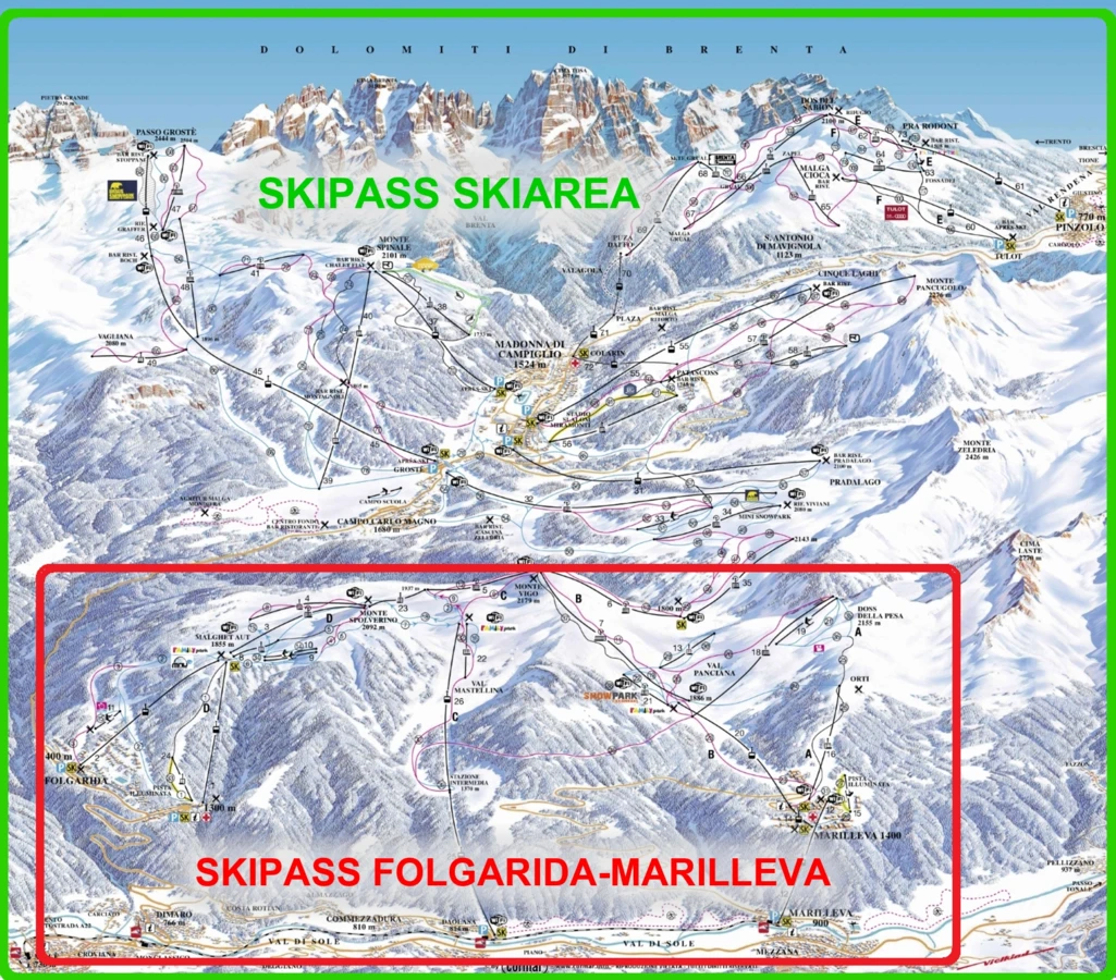 Skipass Skiarea łączy kurorty Folgarida, Marilleva, Madonna di Campiglio i Pinzolo. To łącznie 150 km tras o bardzo zróżnicowanym stopniu trudności, począwszy od długich, szerokich i płaskich tras, po trudne czarne stoki, na których rozgrywane są zawody pucharu świata w narciarstwie alpejskim. Ośrodek obok Cortiny d'Ampezzo jest najbardziej znanym kurortem we Włoszech. Niewątpliwie można tam poczuć prawdziwy klimat włoskiej górskiej miejscowości, z miejscowymi wyśmienitymi restauracjami, kawiarenkami i lokalnymi targami.